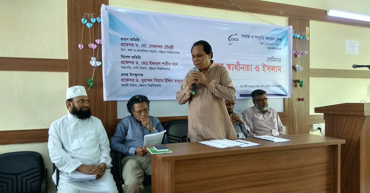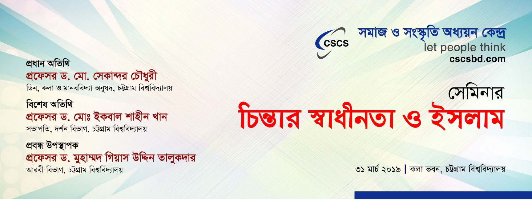 সমাজ ও সংস্কৃতি অধ্যয়ন কেন্দ্রের (সিএসসিএস) উদ্যোগে গতকাল ৩১ মার্চ, ২০১৯, রবিবার চট্টগ্রাম বিশ্ববিদ্যালয়ের কলা ভবন ৩২৪ নং কক্ষে বেলা সোয়া ১১টায় ‘চিন্তার স্বাধীনতা ও ইসলাম’ শীর্ষক একটি সেমিনার অনুষ্ঠিত হয়েছে। অনুষ্ঠানে প্রধান অতিথি ছিলেন চট্টগ্রাম বিশ্ববিদ্যালয় কলা ও মানববিদ্যা অনুষদের ডিন প্রফেসর ড. মো. সেকান্দর চৌধুরী, বিশেষ অতিথি ছিলেন চবি দর্শন বিভাগের সভাপতি প্রফেসর ড. মোঃ ইকবাল শাহীন খান। এতে সভাপতিত্ব করেন সিএসসিএস-এর পরিচালক ও দর্শন বিভাগের সহযোগী অধ্যাপক জনাব মোহাম্মদ মোজাম্মেল হক। এতে মূল প্রবন্ধ উপস্থাপন করেন আরবী বিভাগের প্রফেসর ড. মুহাম্মদ গিয়াস উদ্দিন তালুকদার।